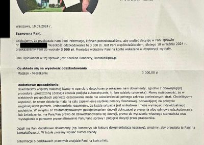 a w zdjęciach skan pisma w sprawie innego mieszkania, zalanego do wys. 1 metra. Tak napisane w treści, że niby wstępnie, ale wytłuszczonym „wysokość odszkodowania”. PZU robicie to źle!